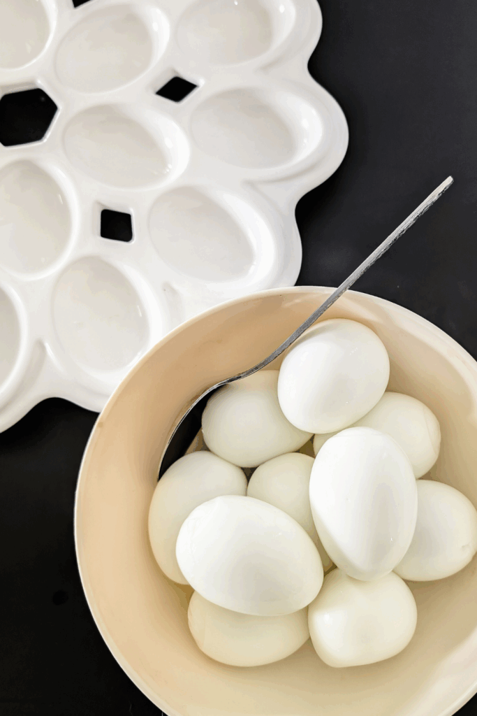- Use older eggs – Slightly older eggs peel more easily than fresh ones. If you just bought a carton, save it for baking and use last week’s eggs here.