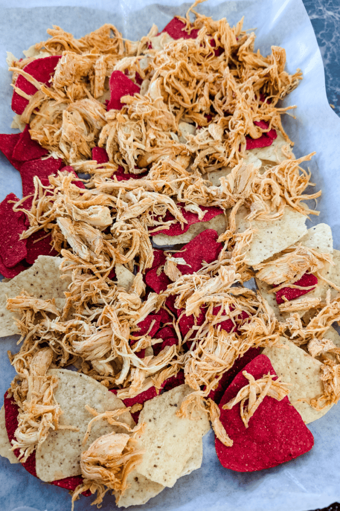 Easy to Assemble: These nachos are surprisingly simple to build. The shredded chicken can be made ahead of time in a Dutch oven and then tossed with buffalo sauce before layering it over the chips. Once everything is assembled on the sheet pan, the oven does the rest of the work while the cheese melts.