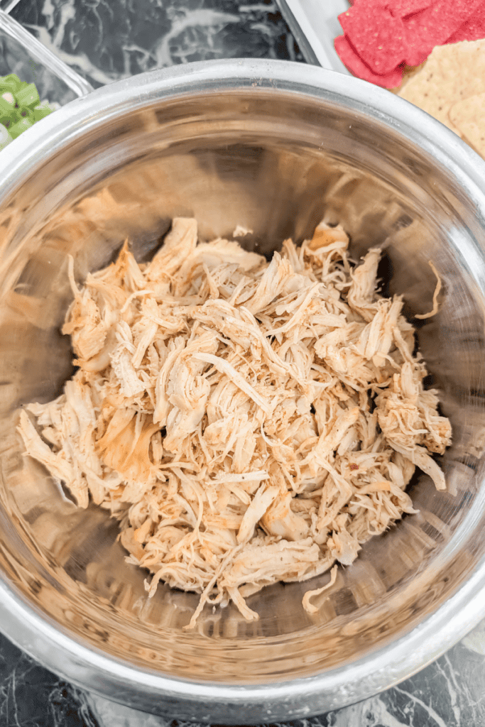 I used shredded chicken that was cooked earlier in a Dutch oven with simple spices. Once the chicken is tender, it pulls apart easily with two forks. If you want to save time, store-bought rotisserie chicken or leftover shredded chicken works just as well.
