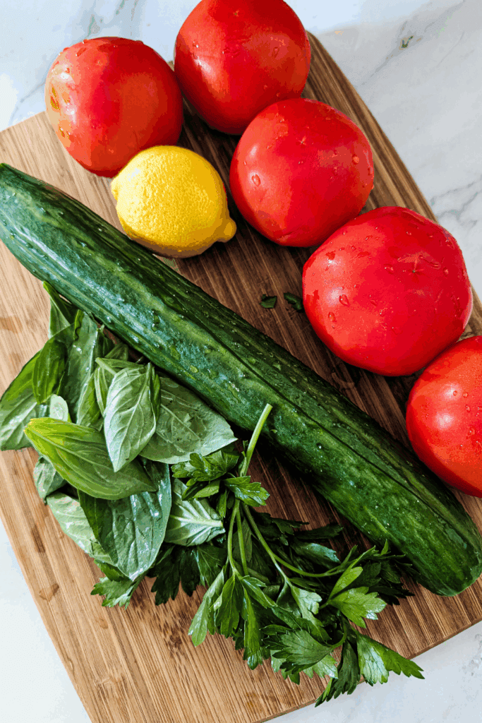 Cooling ingredients. Fresh cucumbers, grape tomatoes, and sweet onion offer a crisp base that’s especially refreshing this time of year.