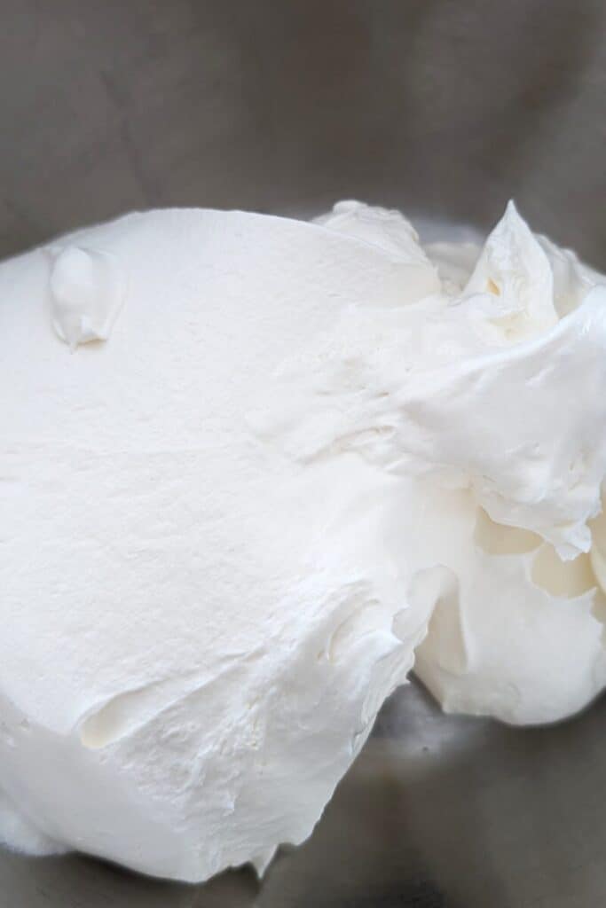 The outcome of blending in the heavy cream is light and creamy. It’s subtly sweet as its only sugars are from the pudding base and the Cool Whip. If you want a firmer frosting or desire a higher sweetness, add icing sugar. Remember, when you add the dry icing sugar, your fluffy cool whip frosting will become stiffer. The more sugar added, the stiffer it will be. Thicker frostings are great for decorating the outside of layer cakes. Softer Cool Whip frosting is excellent for sheet cakes or cupcakes where light and airy is preferred.