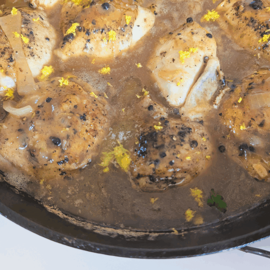 Once the sauce has thickened and the chicken is tender, remove from the heat. For a bit of color, sprinkle the lemon zest over the chicken and garnish with sliced lemon and fresh parsley, if desired. Serve straight from the skillet with a spoonful of sauce over each piece.