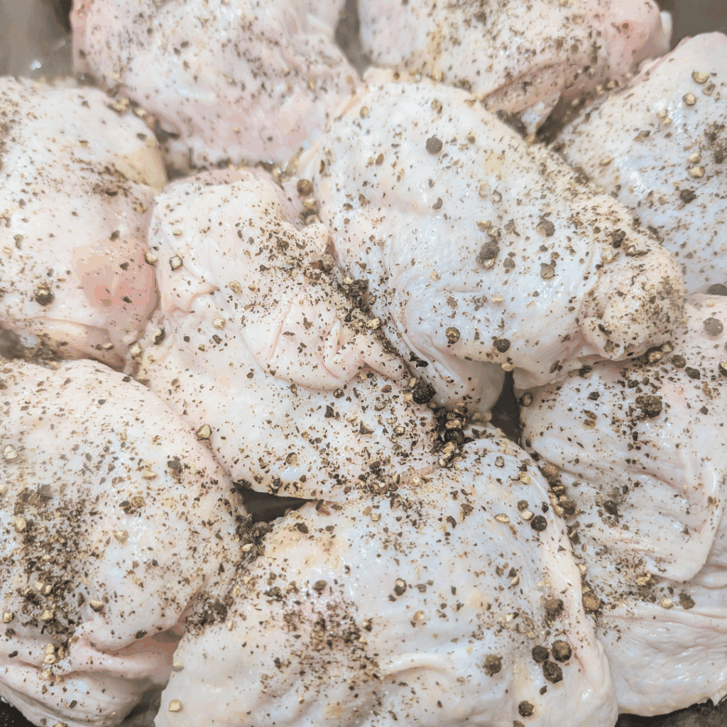 - Place chicken thighs skin side up in the hot pan. Season generously with the pepper-salt blend. (You don't have to use all the seasoning)10 Chicken Thighs, 3 Tbsp Oil