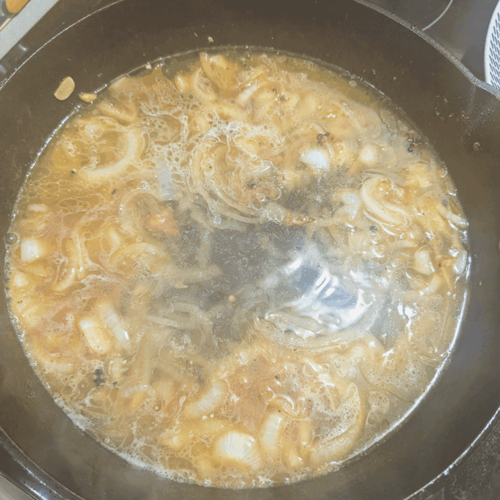 To build the sauce, return the skillet to the stovetop and add chopped onion and minced garlic to the pan drippings. Stir in a splash of chicken broth, scraping up the fond from the bottom of the skillet. Let the onions soften and cook down before adding the remaining broth.