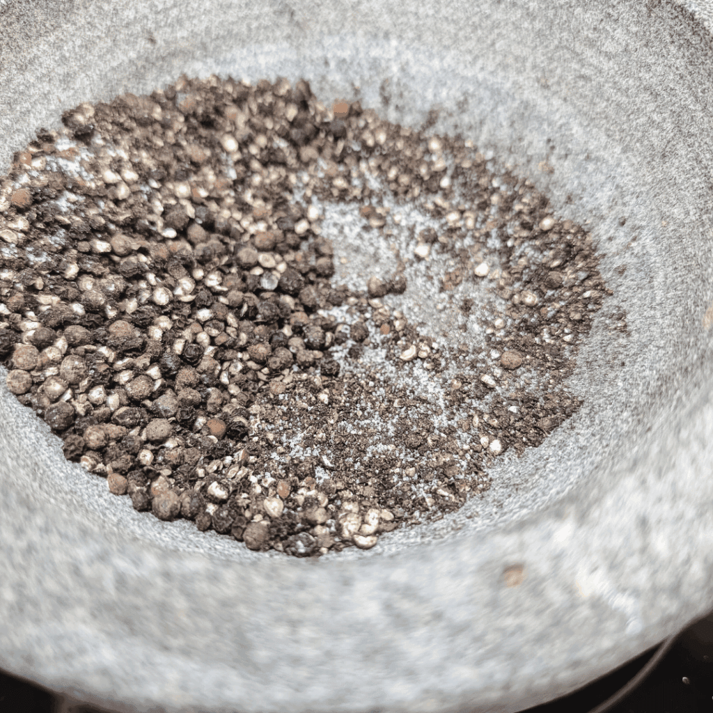 - Using a mortar and pestle, coarsely crack peppercorns, then mix with salt.4 Tbsp Whole Black Peppercorns, 2 Tsp Salt