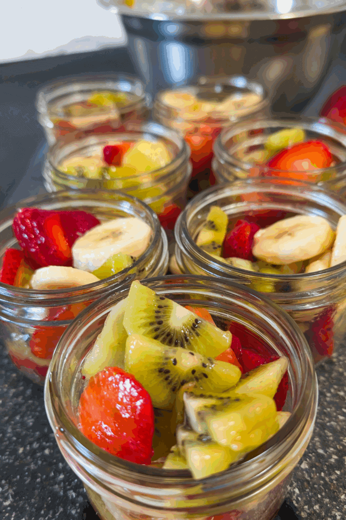 In our house, there are four adults, all of whom are working or studying, and the pace is non-stop. That means healthy eating tends to get overlooked unless snacks are readily available. By taking a large bowl of mixed fruit, tossing it with lemon juice and sugar, and dividing it into jars, I can prep 12 jars in under an hour for a busy week. Everyone gets a nutritious meal component or snack that lasts the entire week.
